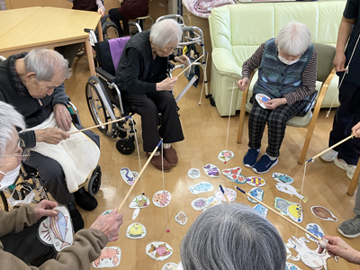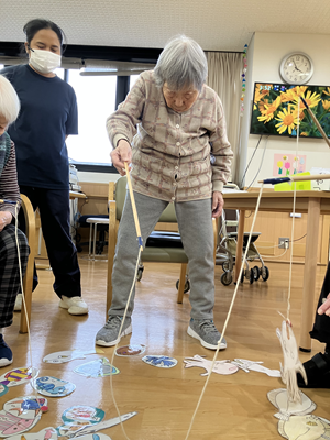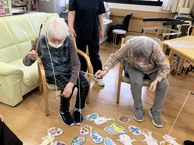 リハビリ体操以外でも日々ご利用者様が参加しやすいリハレクも行っています。今回は魚釣りに挑戦!