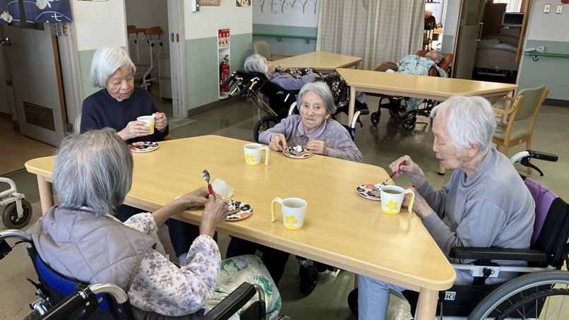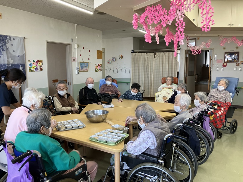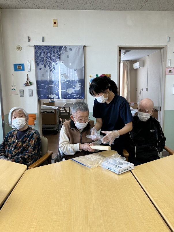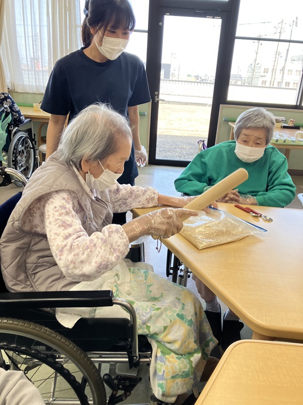 こんにちは。今月のフロア行事で「チョコレートムースケーキ」というお菓子を作りました。皆様とても上手にボウルに生クリームを入れたり、ビスケットを潰したりしていました。とても楽しそうにケーキ作りに参加されていました。おやつの時に提供を行い、皆様とても美味しそうに召し上がられていました(^^♪