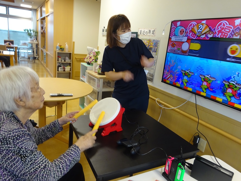 そよかぜホーム3階ユニットです!太鼓の達人というゲームをしました(*'ω'*)皆さん、太鼓なのでなじみがあるのか上手にたたいておられ、思わず、笑みがこぼれていました(*^^*)