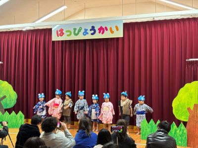 劇遊びやリズム遊び、和太鼓など年齢に合わせた発表をお家の方に見てもらいました。いつもより、ちょっと緊張気味(?)、でも自信に満ち溢れた堂々と発表する姿に胸が熱くなりました。